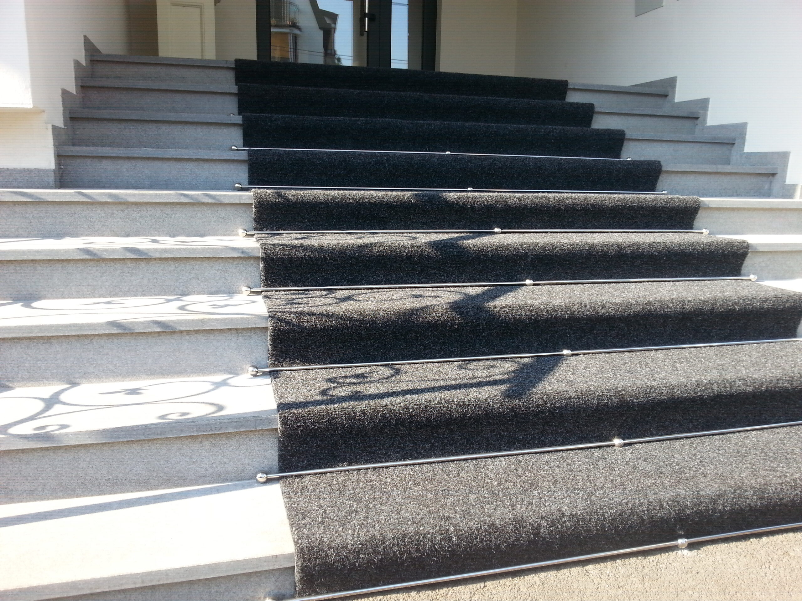 Naši držači imaju jedinstven klik sistem koji olakšava skidanje tepih staze, bez potrebe za ponovnim uvrtanjem i zavrtanjem šrafova. Svi naši držači se prave po meri kupca, a delovi i šrafovi se šalju brzom poštom. Za montažu na vanjskom stepeništu, kupcima šaljemo komplet sa inox šrafovima. Savet i napomena je da šipka držača uvek treba da bude duža od širine tepiha za najmanje 5 cm.